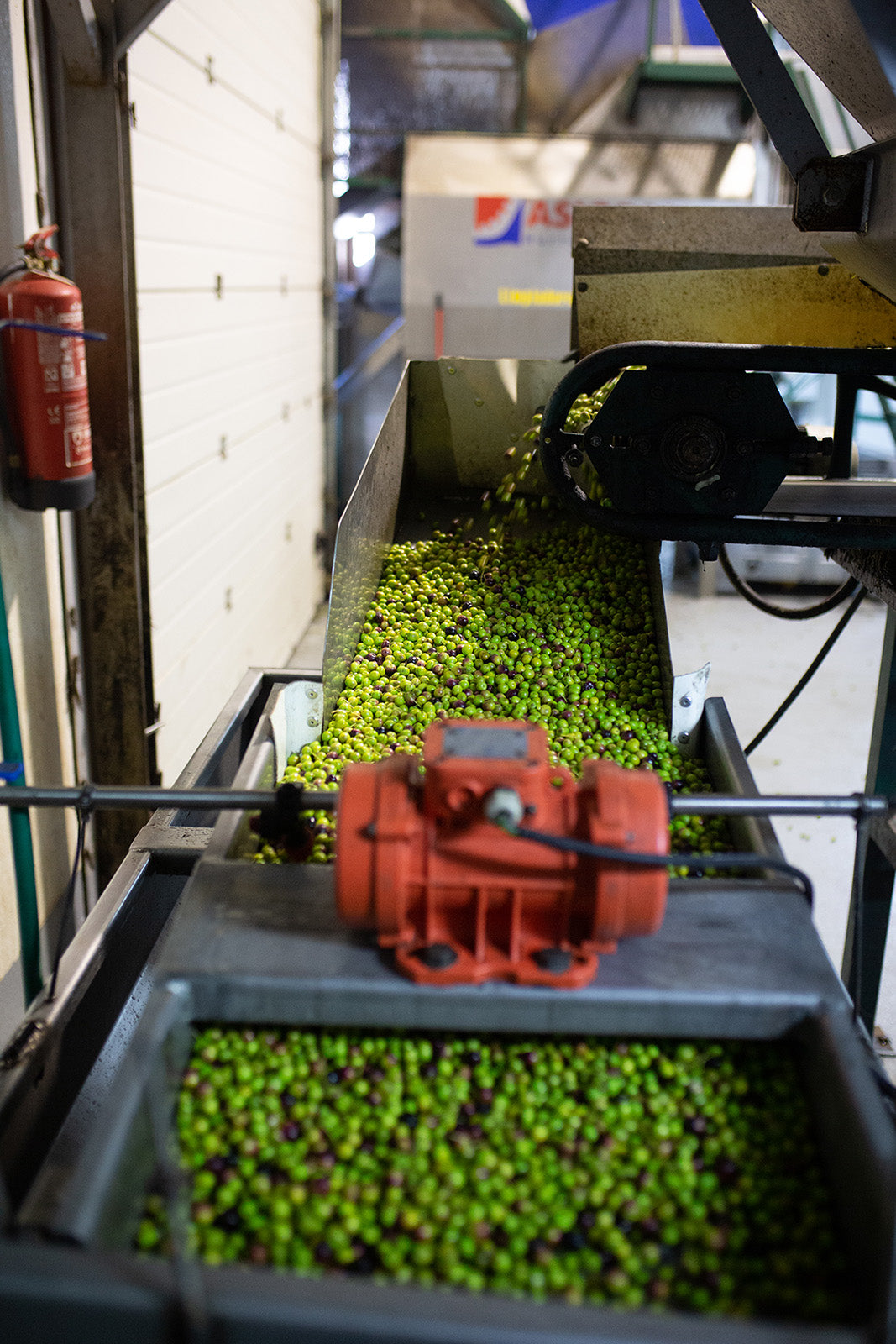 Una vez que las aceitunas llegan a la almazara, se hace una primera inspección visual sobre el estado del fruto, verificando la calidad del mismo. Posteriormente se procesa en la zona de recepción y limpieza donde se separa la aceituna de las posibles impurezas tales como hojas y ramas, mediante un ciclón que las sopla, para pasar a su posterior almacenamiento en tolvas de acero inoxidable y su inmediato procesado. El almacenamiento de la aceituna se hace siempre sin lavar para conservar al máximo la calidad y todos sus atributos